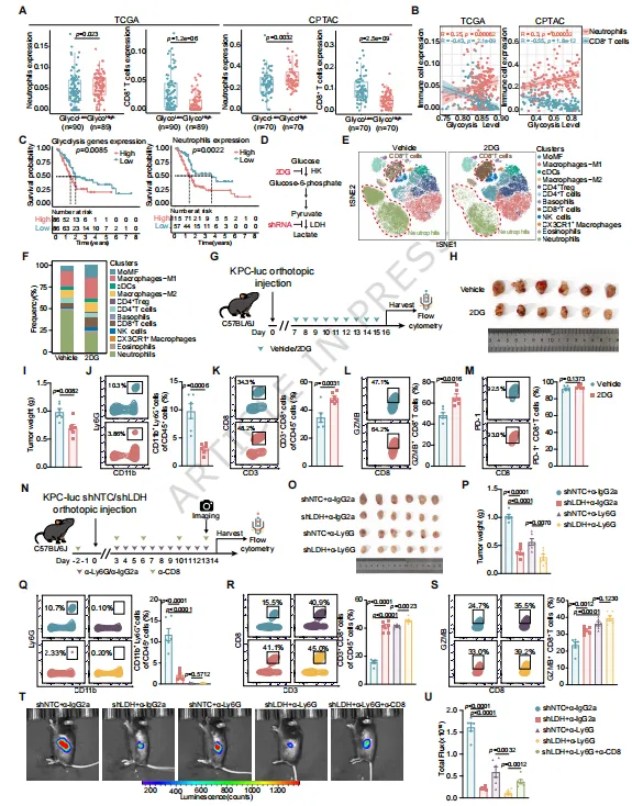 通过数据库分析、糖酵解抑制剂(2DG)处理、LDH敲低及动物模型实验,发现高糖酵解与胰腺癌患者中性粒细胞浸润正相关、CD8+T细胞浸润负相关,抑制糖酵解可减少肿瘤负荷和中性粒细胞浸润,增加CD8+T细胞浸润。