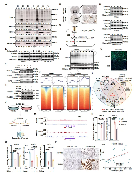 借助Westernblot、CUT&Tag、ChIP-qPCR等实验,发现胰腺癌中H3K18la水平升高,乳酸可调控其修饰,H3K18la直接结合CXCL1启动子区域,促进其转录激活。