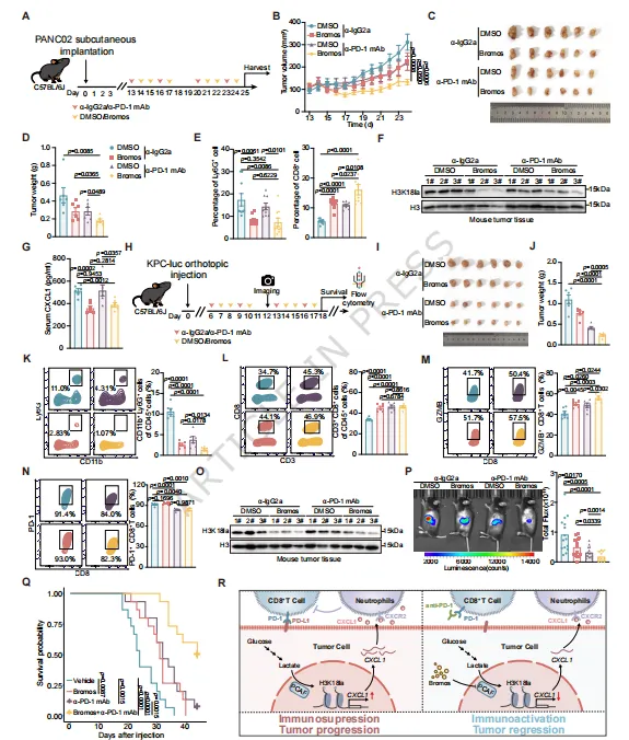 在胰腺癌皮下和原位肿瘤模型中,PCAF抑制剂(溴孢素)与抗PD-1抗体联合治疗,显著降低肿瘤负荷,调节免疫细胞浸润,降低H3K18la和CXCL1水平,延长小鼠生存期。