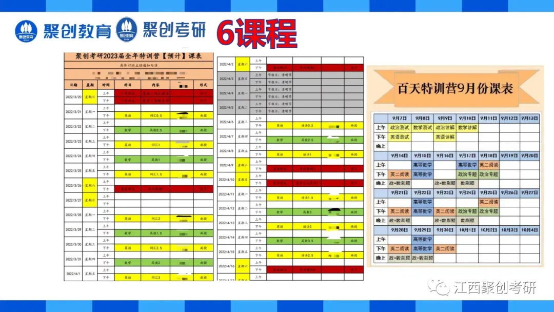 江西聚创考研二战集训营采用六位一体的服务体系,辅导内容非常详细,是包含但不限于:择校择专业、学习计划安排、考研信息收集、学习效果检验、答疑、复试、调剂准备等全程全方位个性化的高端辅导。