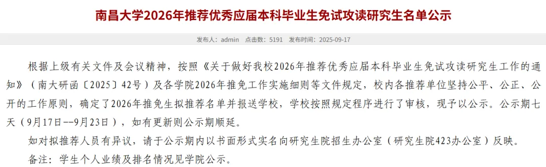 2025年9月,南昌大学各学院发布了推荐2026年优秀毕业生免试攻读研究生的名单公示。