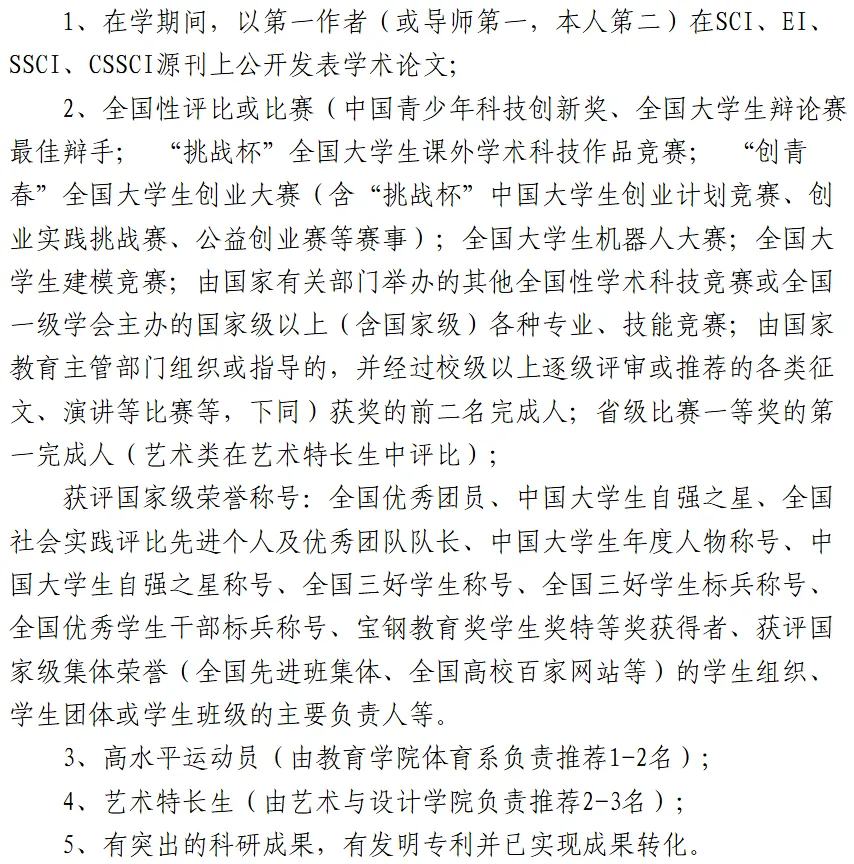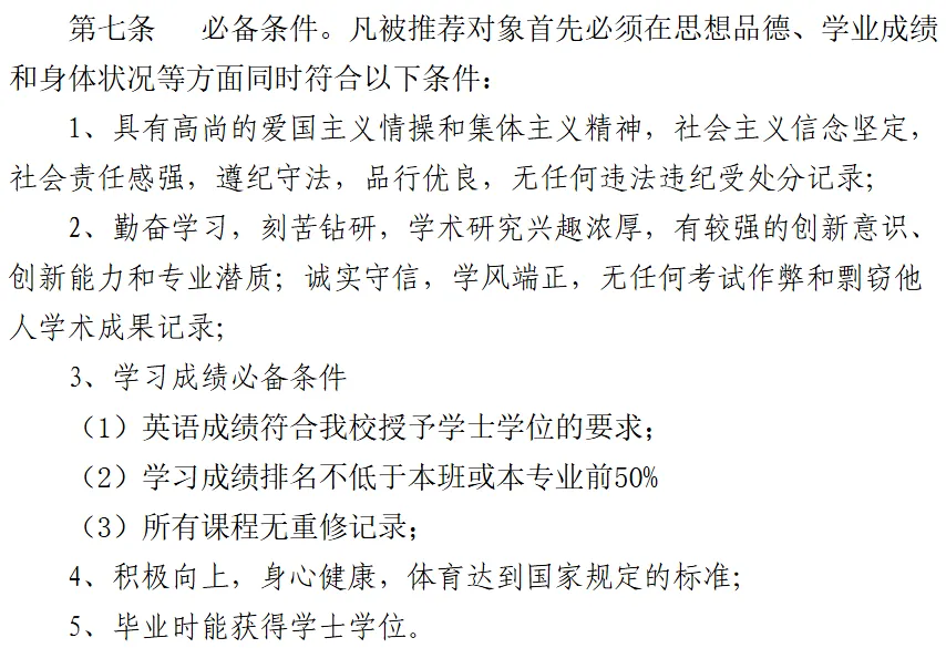 其中,对有特殊专长或具有突出培养潜质者,可破格推荐,符合必备条件中第七条的第1、2、4、5款,且至少符合以下条件中的一条,方可申请破格推荐。具体如下: