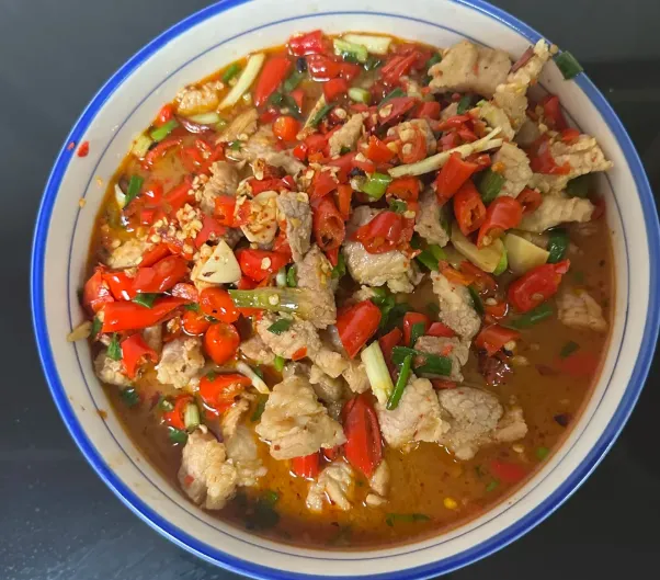 最不能错过的,是“万载剁肉”。这菜看着土,吃着是真香。做法其实简单:选上好的土猪肉,肥瘦分开,全部手工剁碎,不能用机器绞,绞了就没魂了。先炒肥肉出油,再下瘦肉和大量的红辣椒、蒜末爆炒。肉丁在油里滚过,裹着辣味,一勺肉能配三碗饭。吃完辣的,必须来一碗万载百合汤,清甜、软糯,火气一下就压下去了。
