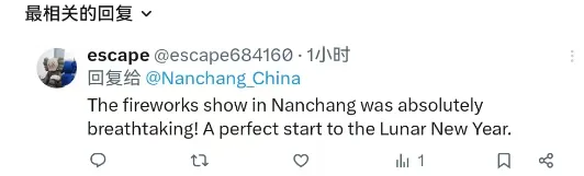 网友“escape”直言:“The fireworks show in Nanchang was absolutely breathtaking! A perfect start to the Lunar New Year.”(南昌的烟花秀美得令人窒息!这是农历新年最完美的开场。);