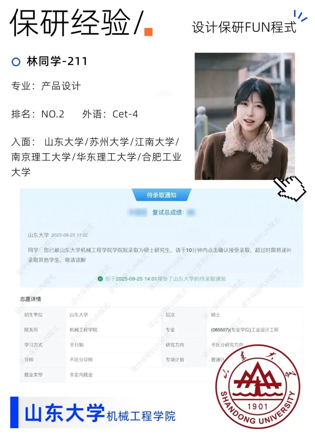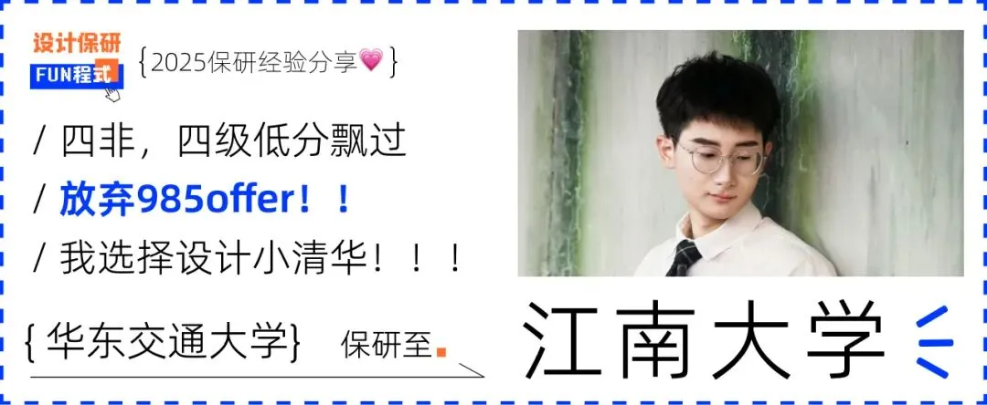 保研投递阶段真的特别繁琐,每个学校的报名系统都不一样,每次填写信息都要花半个小时以上。我的建议是,提前把个人所有信息整理成备忘录或表格,填报时直接复制粘贴,能节省大量时间。 还有一个容易被忽略的点:不同院校的专业归属可能不一样。我学的是产品设计,很多院校的艺术学院不招这个专业,反而会把它放在机械工程学院——大家多留意这类信息,说不定能“捡漏”心仪院校。 最重要的原则是“海投”!不要因为一次拒绝就放弃,有些院校夏令营没通过,预推免反而会有机会。比如我投递江南大学夏令营时就被拒绝了,但预推免时顺利入选,还成功拿到了offer!