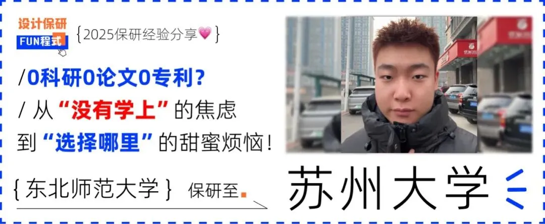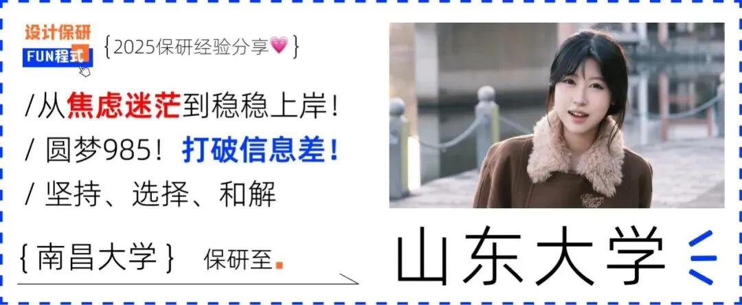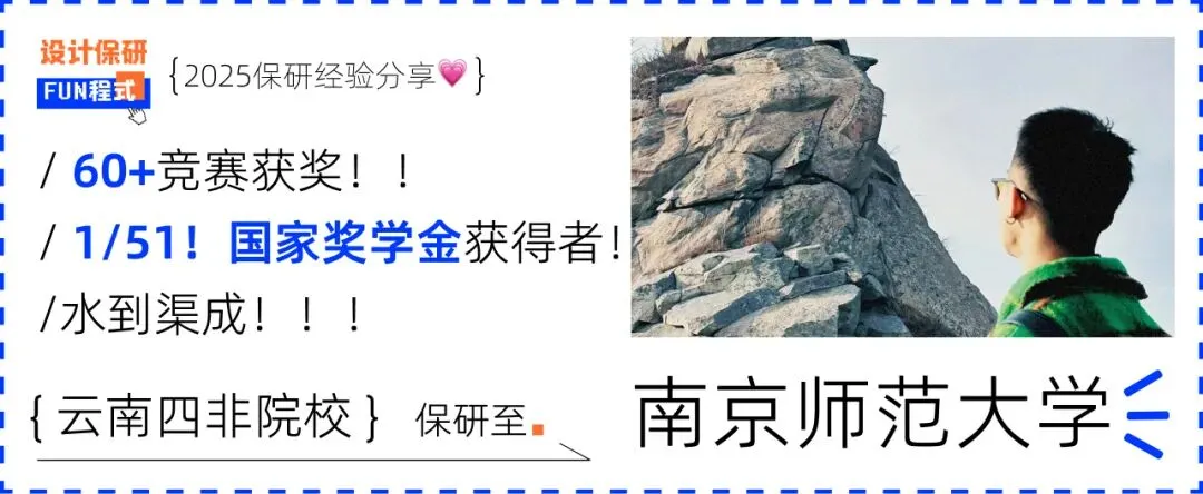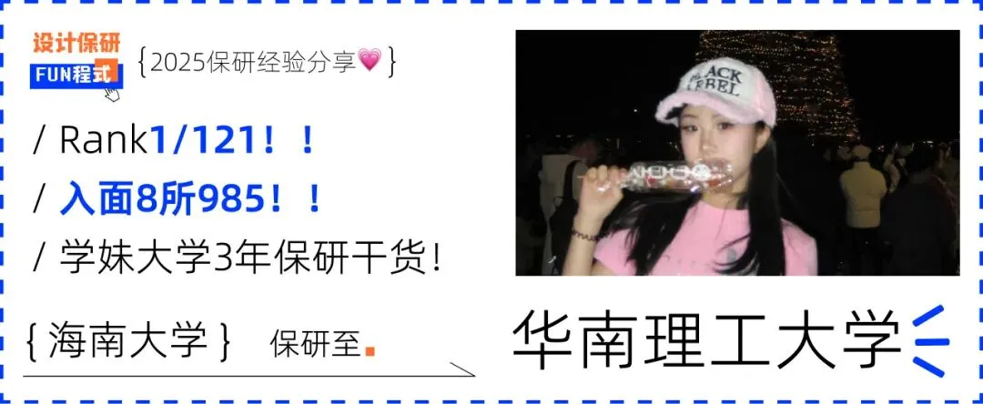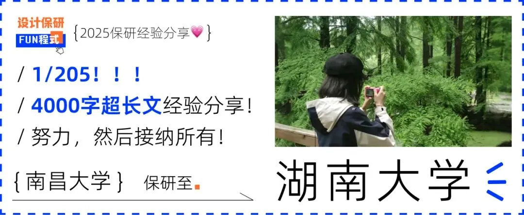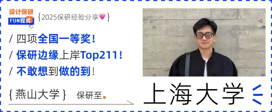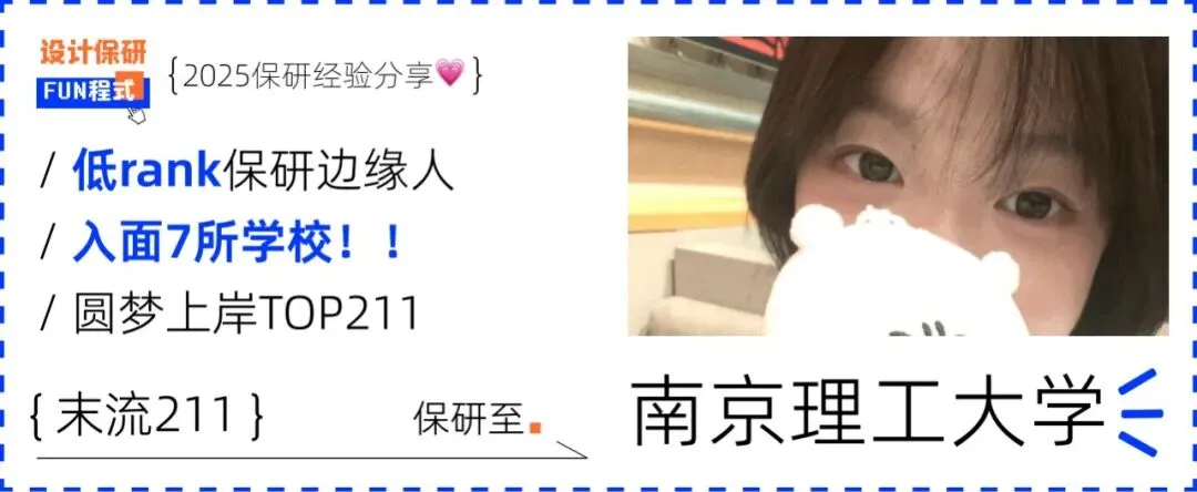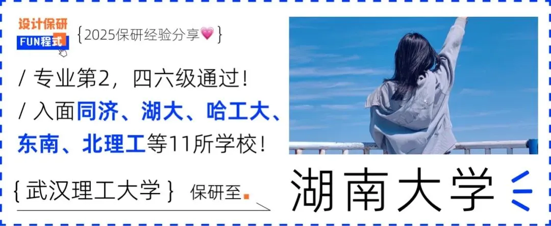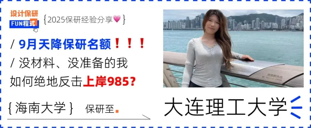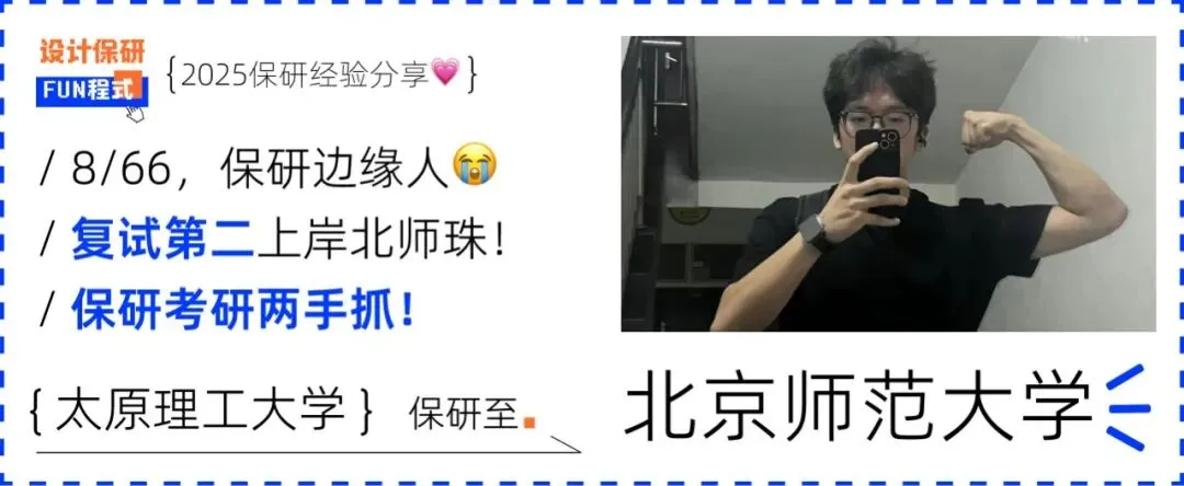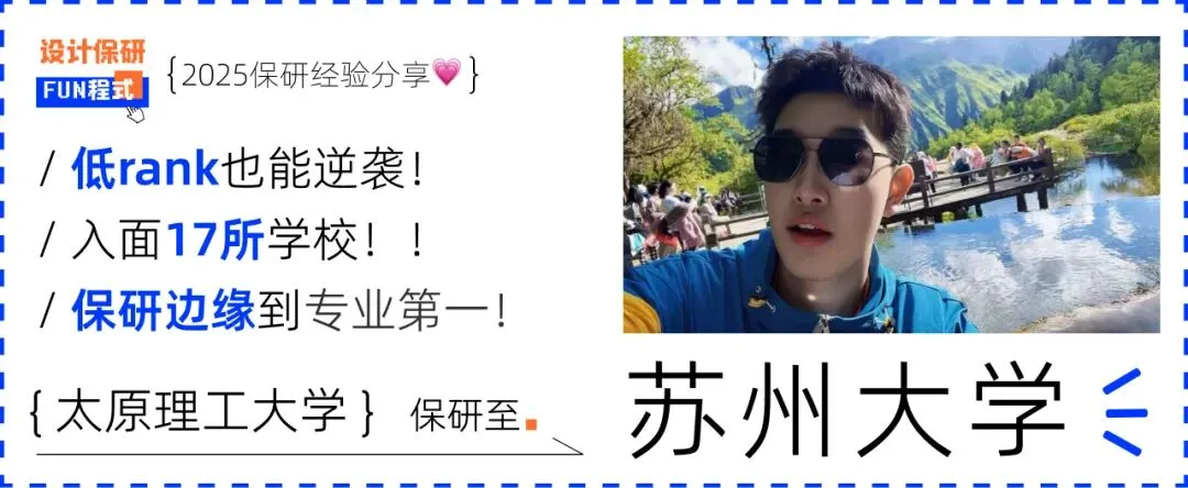 保研路上总会遇到各种挫折,可能是投递被拒,可能是面试失利,也可能是制作作品集时的瓶颈。但请一定不要轻易放弃——无数次大大小小的挫折,最终都会成就更强大的我们。 我分享一个自己坚持下来的小方法:从高中集训到保研上岸,每次想放弃的时候,我都会幻想成功后的场景,想象自己拿到offer的那一刻,瞬间就有了重新出发的动力。