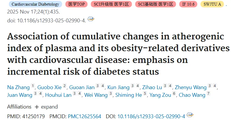 南昌大学基于CHARLS,将 AIP 与 BMI、内脏脂肪指数等肥胖指标结合构建衍生物,首次系统探究其累积变化与 CVD 的关联,明确糖尿病的关键修饰作用,为 CVD 精准风险分层提供全新高效评估指标。