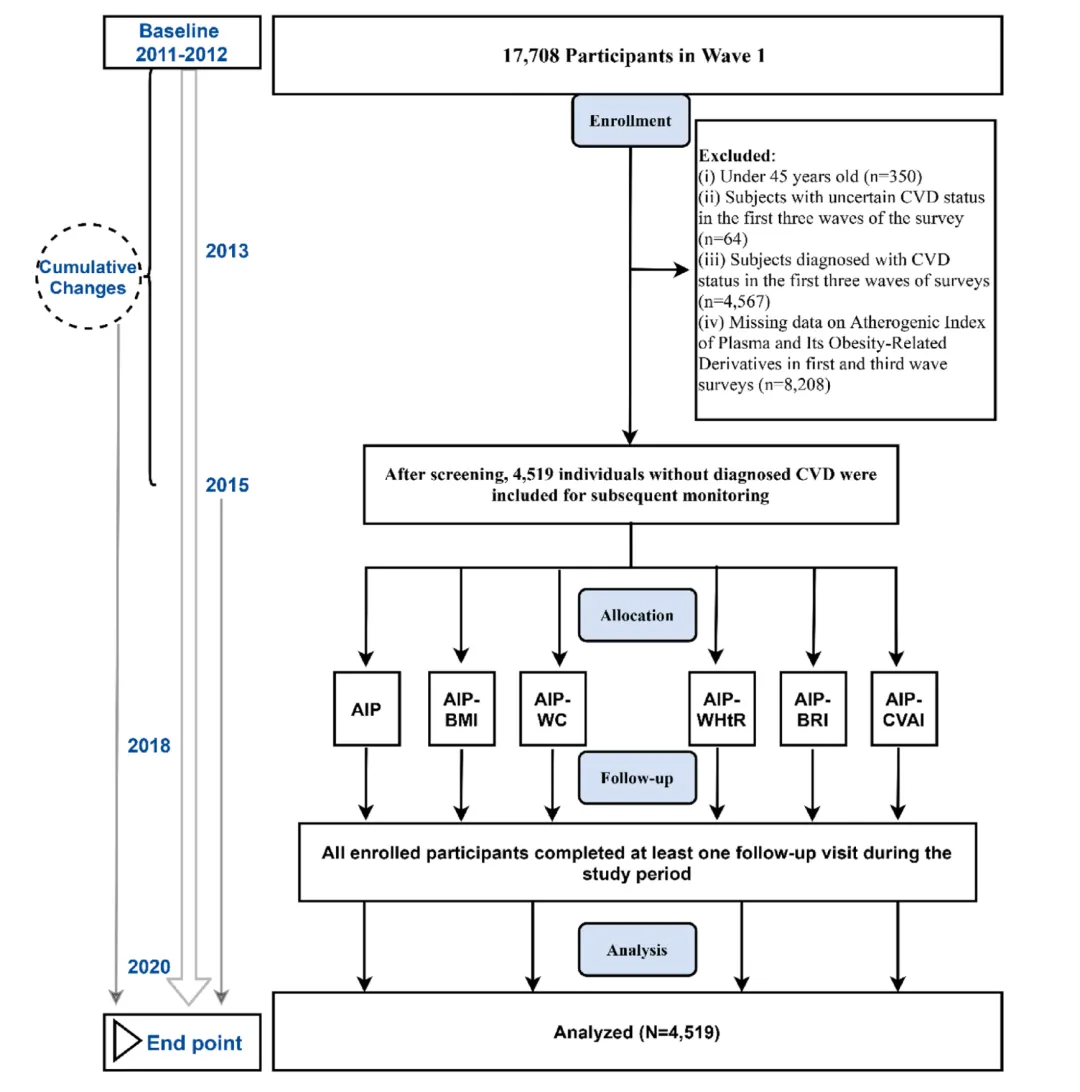 研究队列:纳入 CHARLS 中 2011-2015 年 4519 名中老年人,中位随访 8 年,记录 2018-2020 年新发 CVD(含心脏病、卒中)事件,卒中为次要结局。