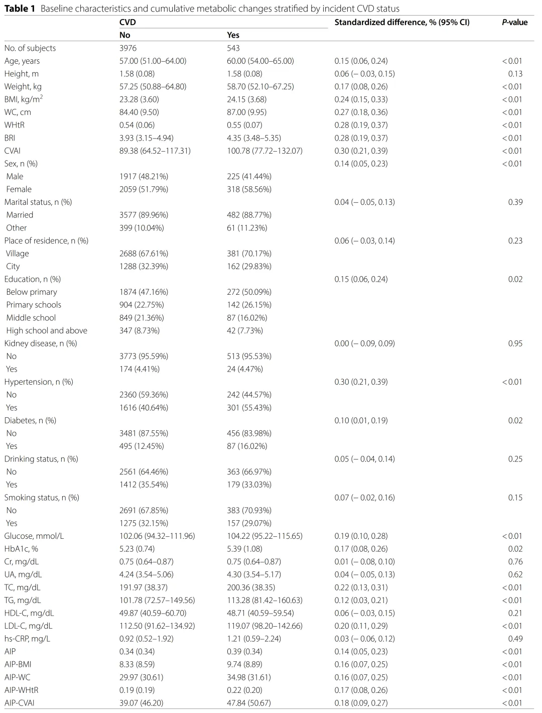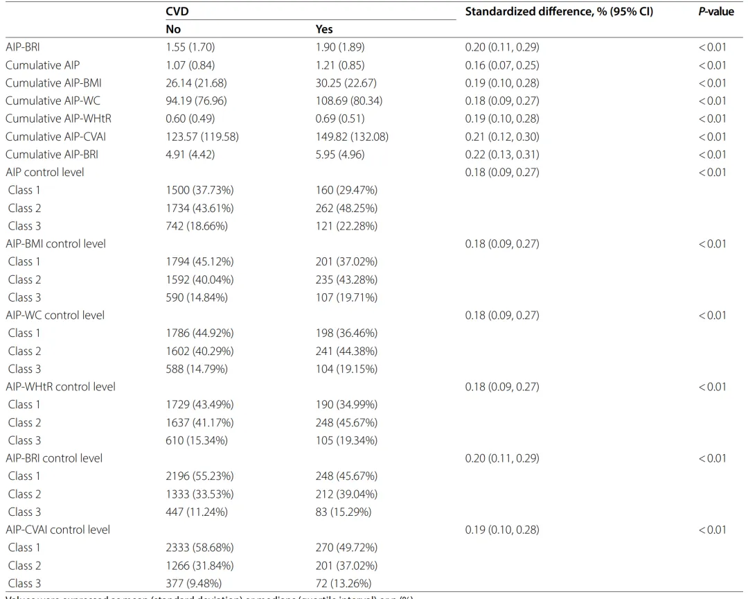 随访期间共新发 CVD 543 例(12.02%),高风险人群表现为年龄更大、肥胖指标更高,高血压 / 糖尿病患病率更高,且 AIP 及其衍生物的基线水平、累积暴露量显著更高,控制水平更差。表1:基线特征及按心血管疾病发发状态分层的累积代谢变化
