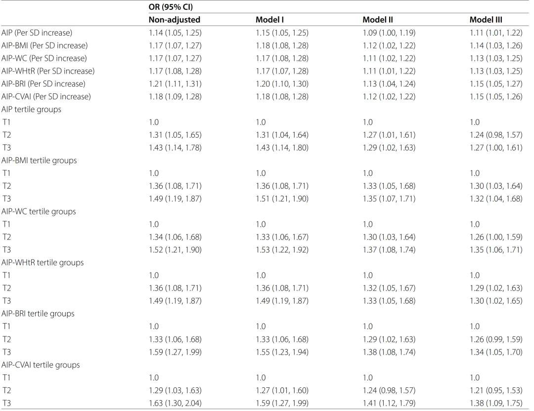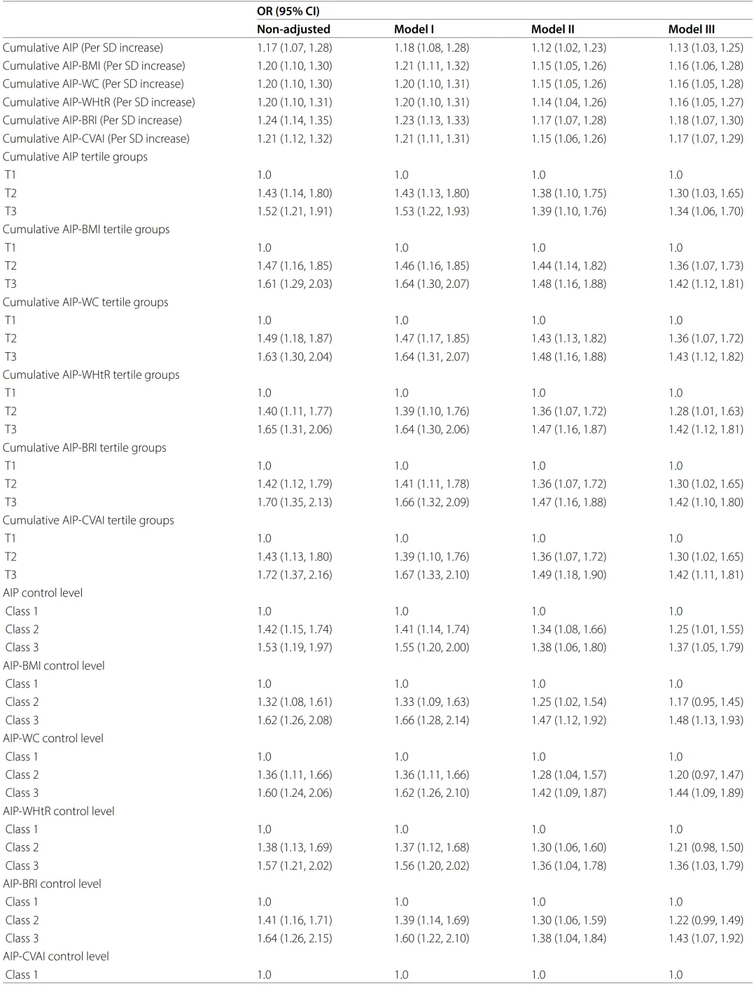 AIP 及其衍生物的累积变化与 CVD 呈线性正相关,累积暴露量中 AIP-BRI(OR=1.18)、AIP-CVAI(OR=1.17)关联最强;控制水平较差者 CVD 风险显著升高,AIP-CVAI 控制较差者风险升高 51%(OR=1.51)。表3:AIP累计变化与其肥胖相关衍生物与心血管疾病事件的关联