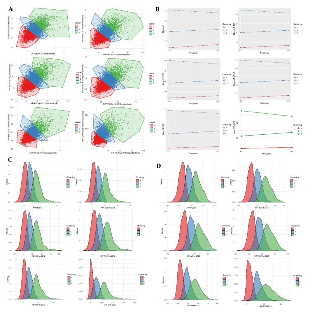 图2:2012年至2015年间AIP、AIP-BMI、AIP-WC、AIP-WHtR、AIP-BRI和AIP-CVAI变化的聚类