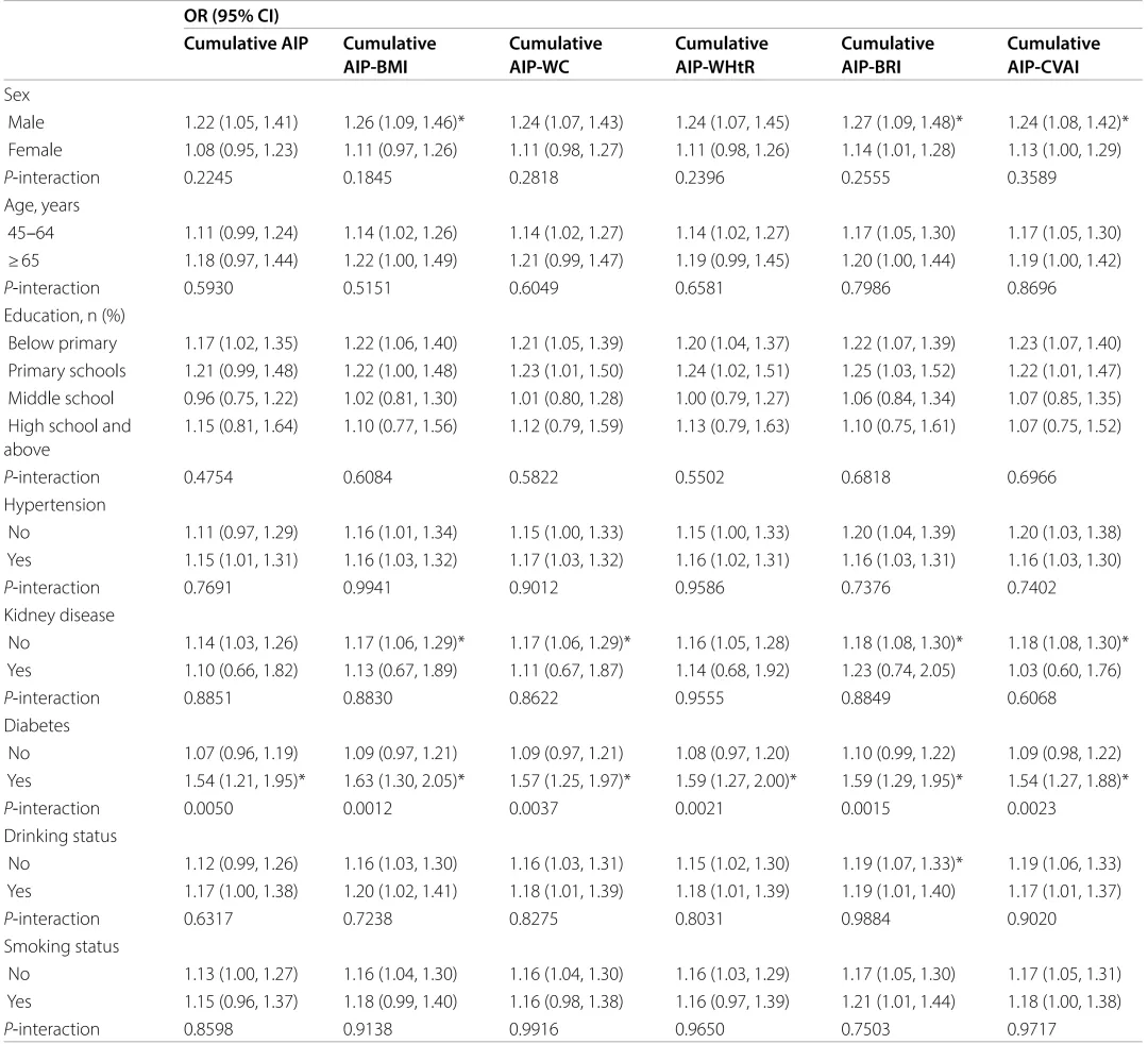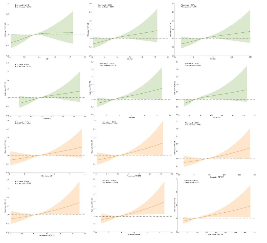 图3:基线/累积AIP与其肥胖相关衍生物与受限立方样本的剂量-反应关系