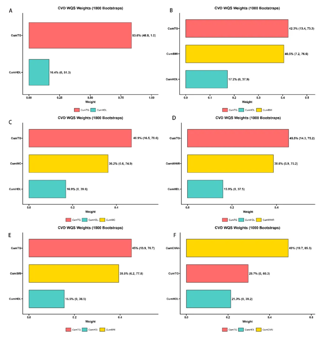 加权分位数和回归显示,累积 TG 和肥胖指标是 CVD 风险的核心驱动因素;中介分析证实,累积 HbA1c在 AIP 及其衍生物与 CVD 的关联中起部分介导作用,介导比例约 10.58%-11.45%。图4:通过加权分位和回归,累计肥胖指数、累计HDL-C和累计TG的相对权重对心血管疾病风险有贡献