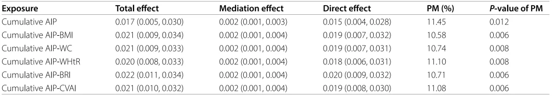 表5 :中介分析:累积血红蛋白A1c对累积AIP(及其肥胖相关衍生物)与心血管疾病关联的影响