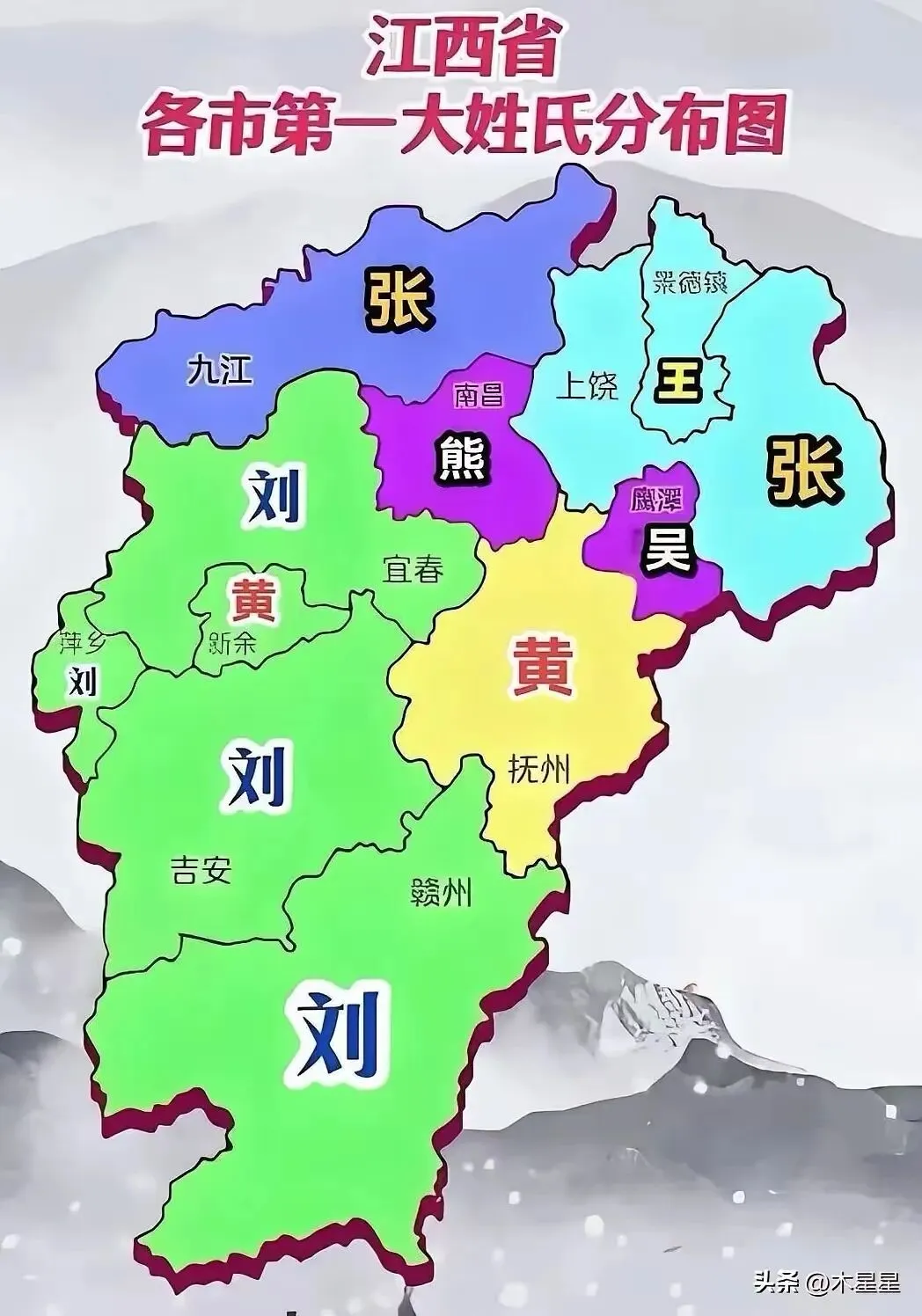 江西的姓氏分布有点特殊!江西的第一大姓并不是李姓也不是王姓!而是刘姓!江西有三个人口大市赣州,吉安和宜春的第一大姓都是刘姓!而南昌的第一人口大姓竟然是熊姓!熊姓在全国比较少见,但却是南昌的第一大姓!