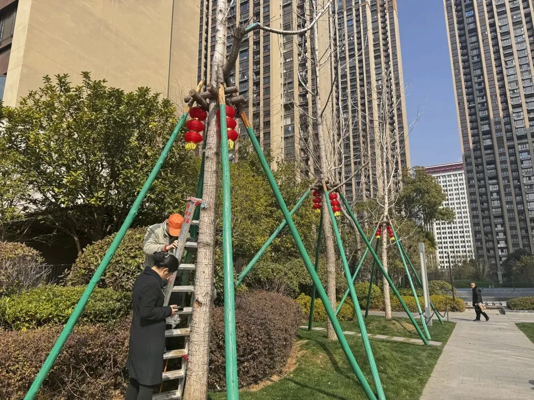 白日里的园区,更是一派热火朝天的忙碌景象。物业工作人员们不畏严寒,踩着梯子、拿着工具,有条不紊地在树木上悬挂红灯笼。一个个红彤彤的灯笼高高挂起,在湛蓝的天空下格外醒目,象征着新的一年红红火火、吉祥如意。从园区入口到中心步道,从景观树木到单元门口,每一处布置都凝聚着红色物业的用心,每一抹红色都承载着对业主的美好祝福。