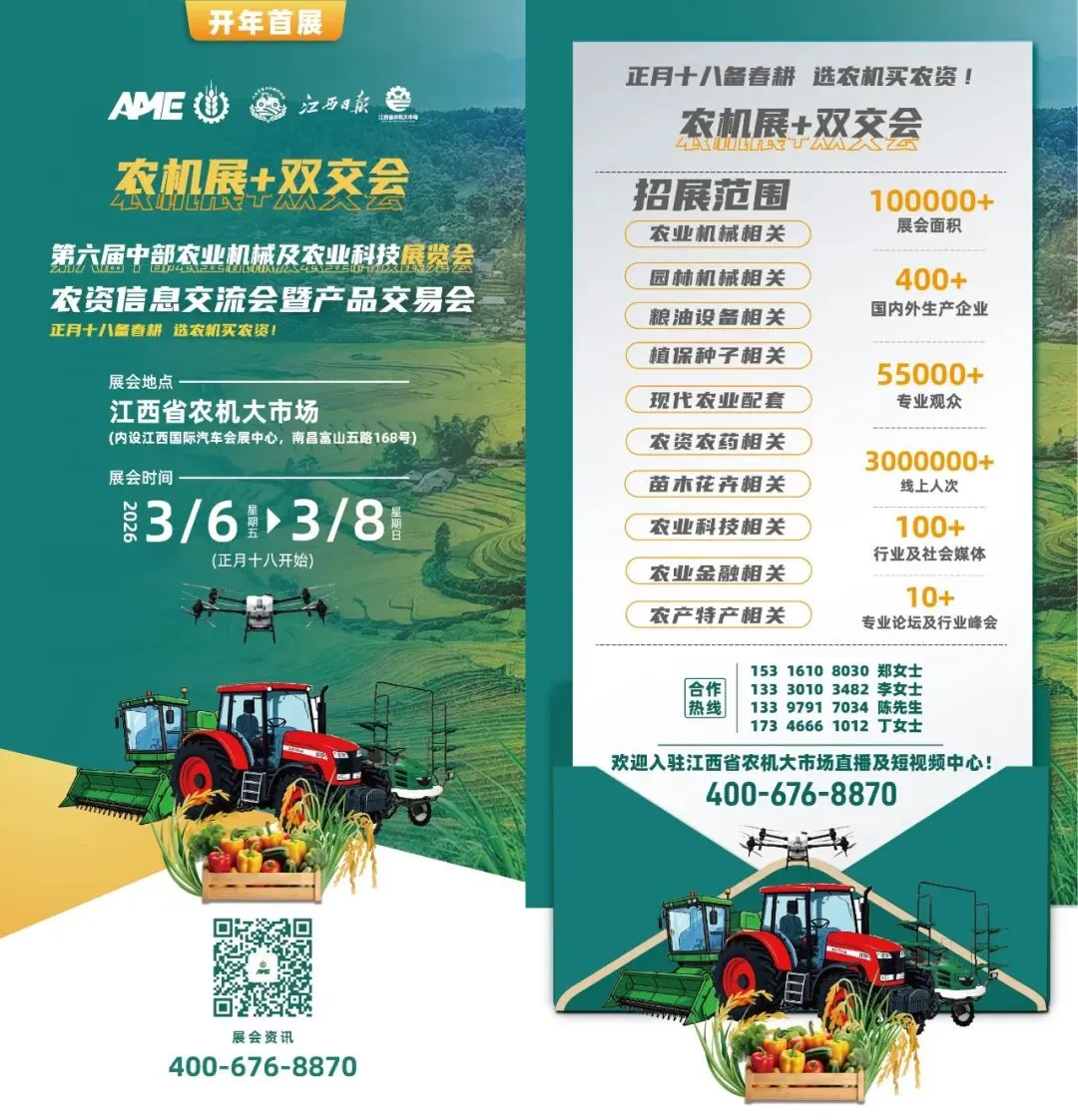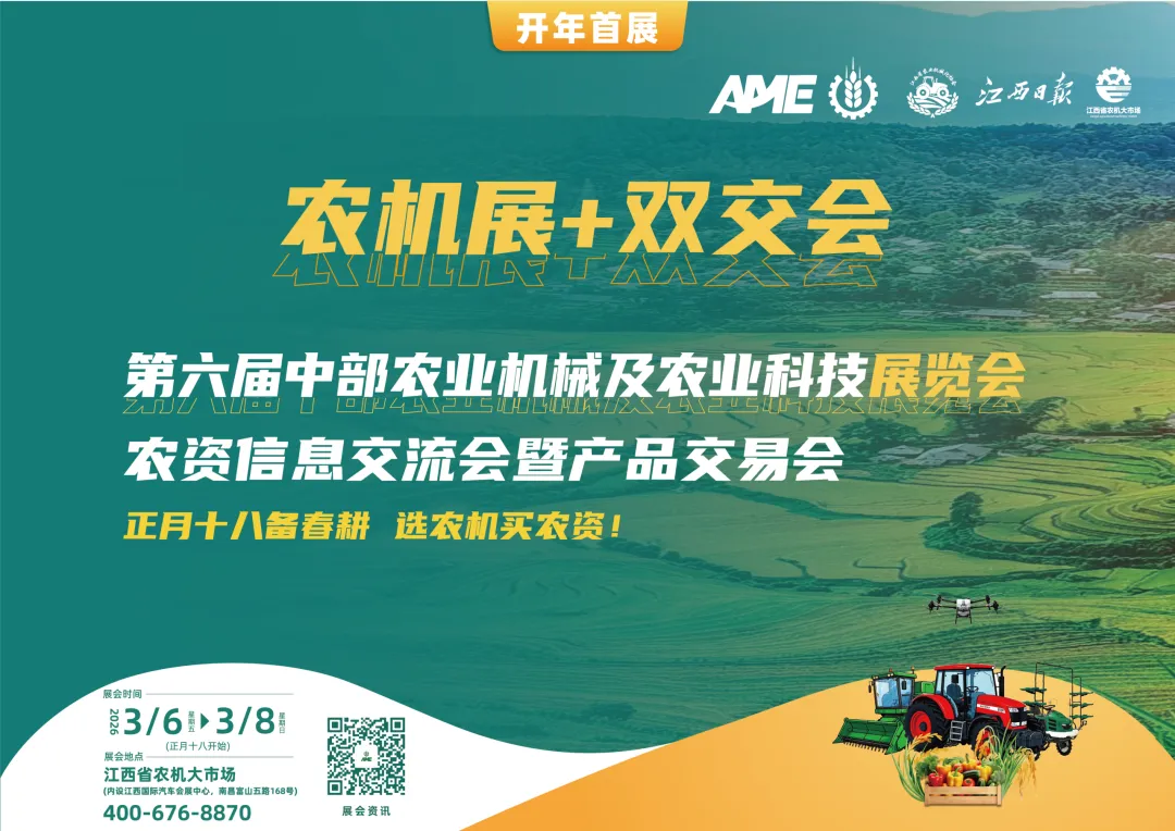 第六届中部农业机械及农业科技展览会将于2026年3月6-8日(正月十八开展)在江西省农机大市场(内设江西国际汽车会展中心)举办,同期举办农资信息交流会暨产品交易会,着力打造集装备展示、技术交流、资源对接于一体的综合性平台。