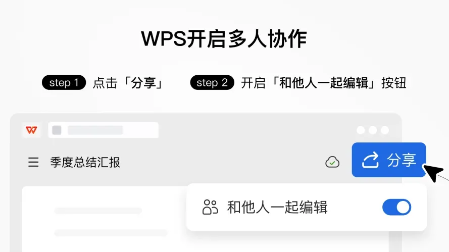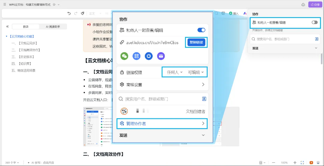 入口:点击文档右上角【分享】按钮—开启【和他人一起查看/编辑】,复制链接分享给需要同步协作的对象。