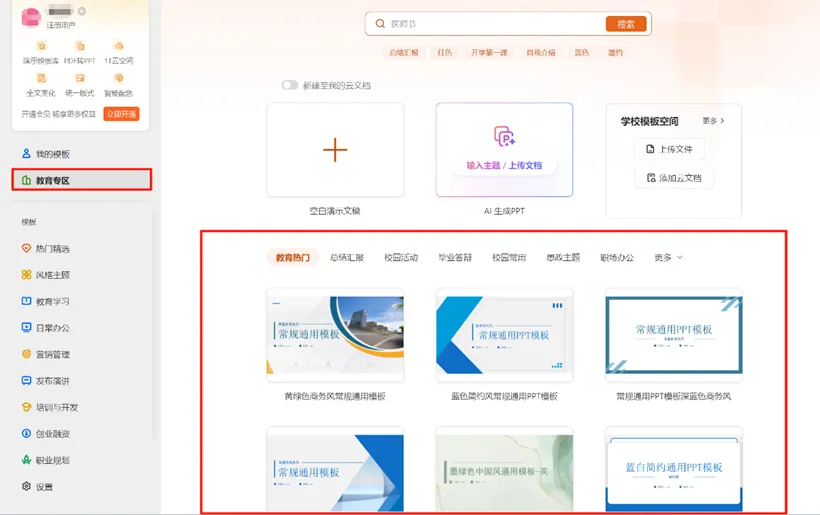 海量模板任选,满足多种使用场景。让你专注内容创作,无需再为版式担忧。模板库入口:【新建】—【演示/文字/表格】—【教育专区】