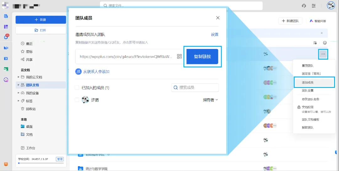 教程:新建团队后,可右键点击团队,选择【添加成员】—【复制链接】,分享邀请链接给团队成员,成员接受邀请加入团队后即可实现团队资源共享。