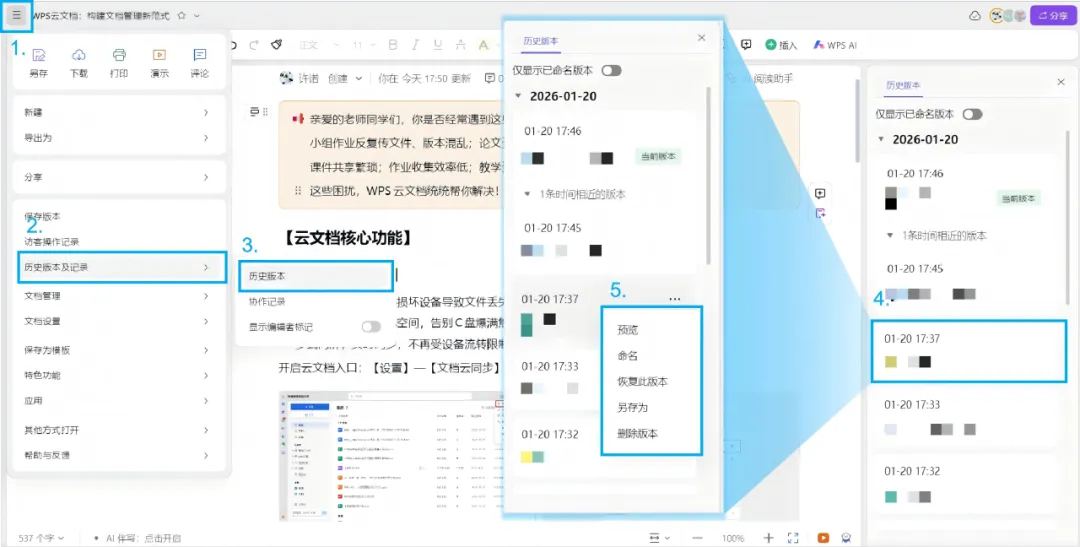 入口:点击文档左上角【更多】菜单,选择查看历史版本。