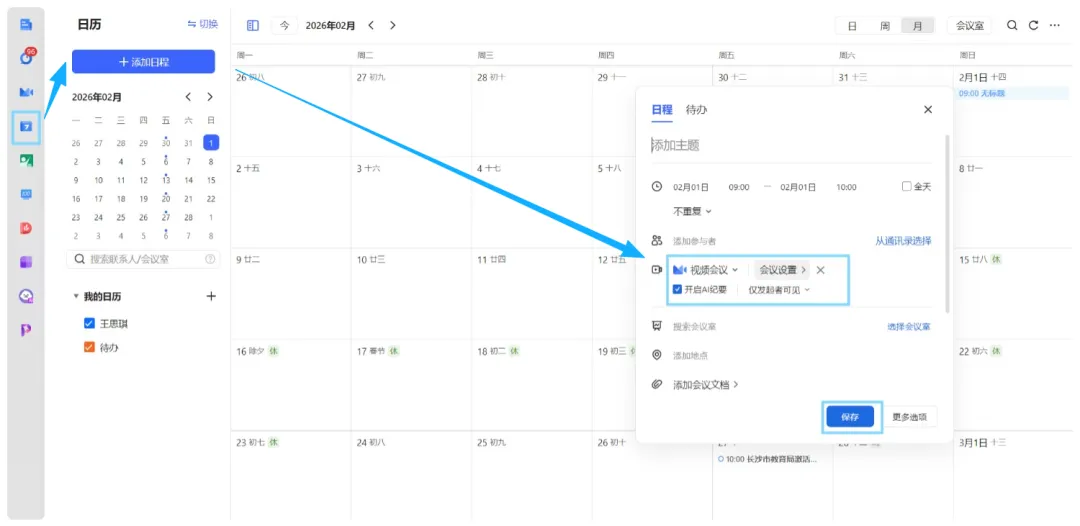 3.【创建日程发起会议】在日历中标记日程,随时随地发起会议交流。