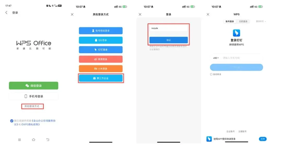 打开WPS Office移动端,点击【其他登录方式】选择【第三方企业】。