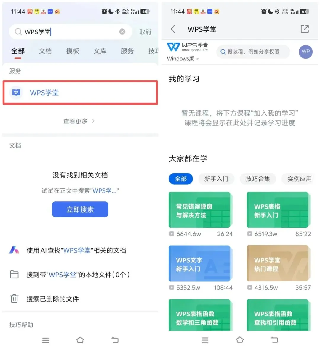 2.在搜索栏输入【WPS学堂】,点击【WPS学堂】即可进入页面学习相关功能。