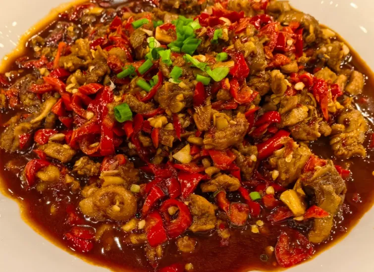 最不能错过的,是莲花血鸭。这道菜讲究的是“碎”和“鲜”。鸭肉得切成指甲盖大小的碎丁,配上大量的红辣椒和蒜头爆炒。关键在最后,临出锅时淋上新鲜鸭血,猛火快翻,让每一粒鸭肉都裹上浆红色的外衣。夹一筷子送嘴里,鸭肉嫩,鸭血滑,辣味瞬间炸开,一边吸气一边还想再来一口,这才是萍乡的味道。