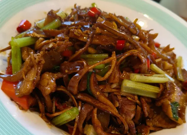 【烟笋烧肉】:这道菜讲究个“耐心”。笋干得提前一天泡发,把那股子烟熏火燎的硬气泡软。切成丝,和带皮的五花肉一起下锅。肉得肥,油得大,因为笋干是“刮油”的狠角色。大火爆炒,再小火慢炖,等到肉里的油脂全被笋吸进去,笋丝变得油润黑亮,咬一口,既有肉的丰腴,又有山野的烟火气,那滋味,绝了。