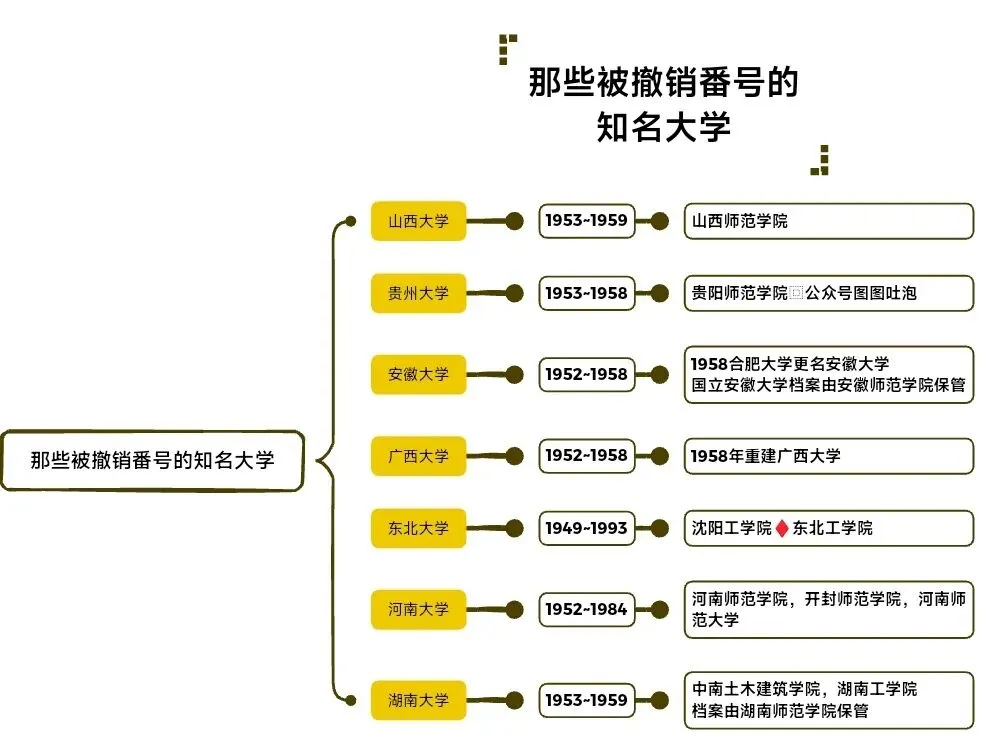 其实在院系调整期间,有多所知名大学的番号被取消,包括山西大学,贵州大学,安徽大学,广西大学,东北大学,河南大学和湖南大学,传承彻底断绝。