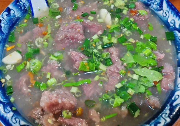 关于牛肉汤: 做法其实讲究。选刚宰杀的新鲜黄牛肉,切成小丁,不是直接煮,而是要裹上一层红薯粉。水滚了下锅,烫个几十秒就捞。肉因为裹了粉,滑嫩得不像话,汤里放点姜末和葱花,那股鲜味,是直接往鼻子里钻的。