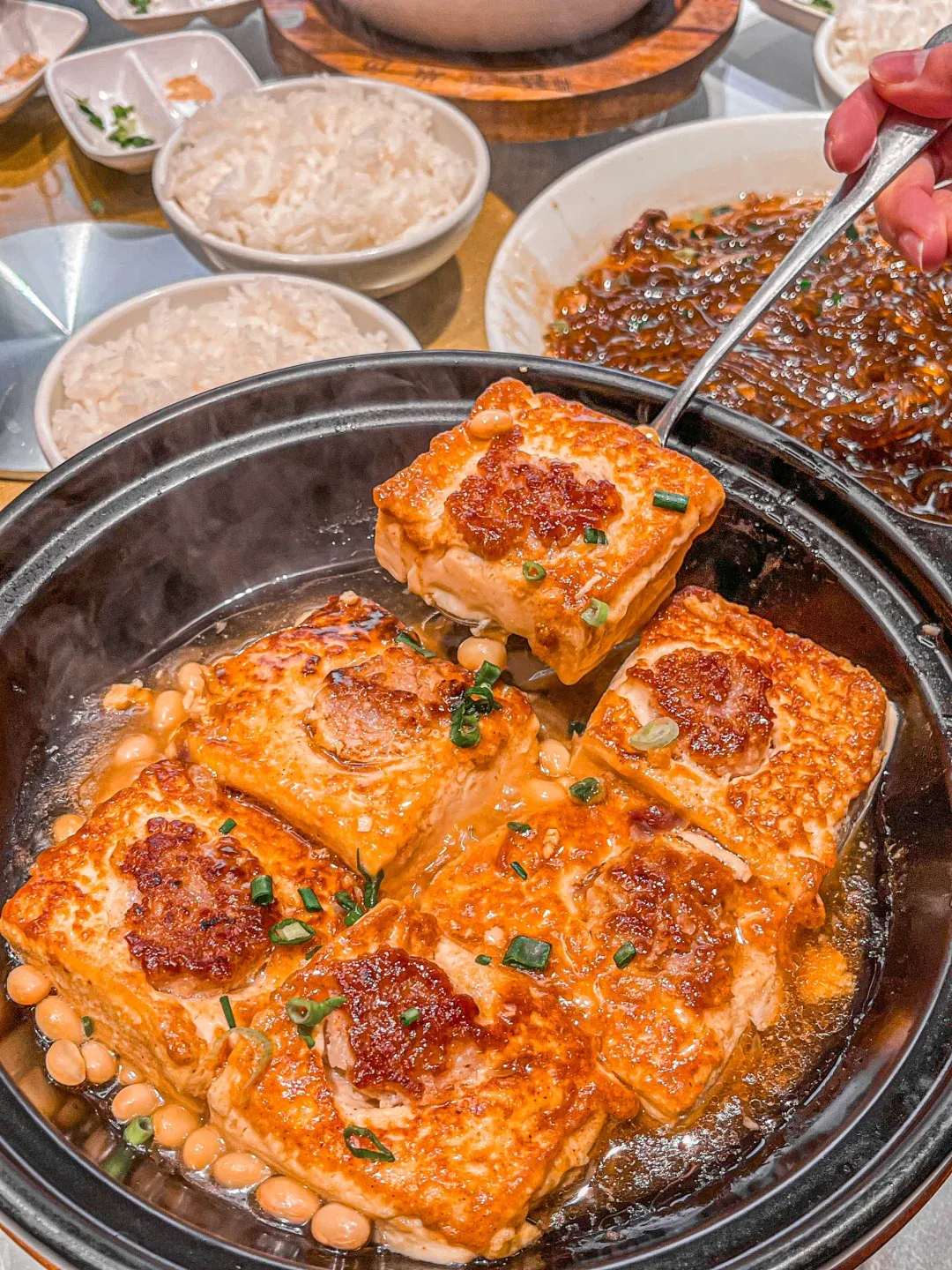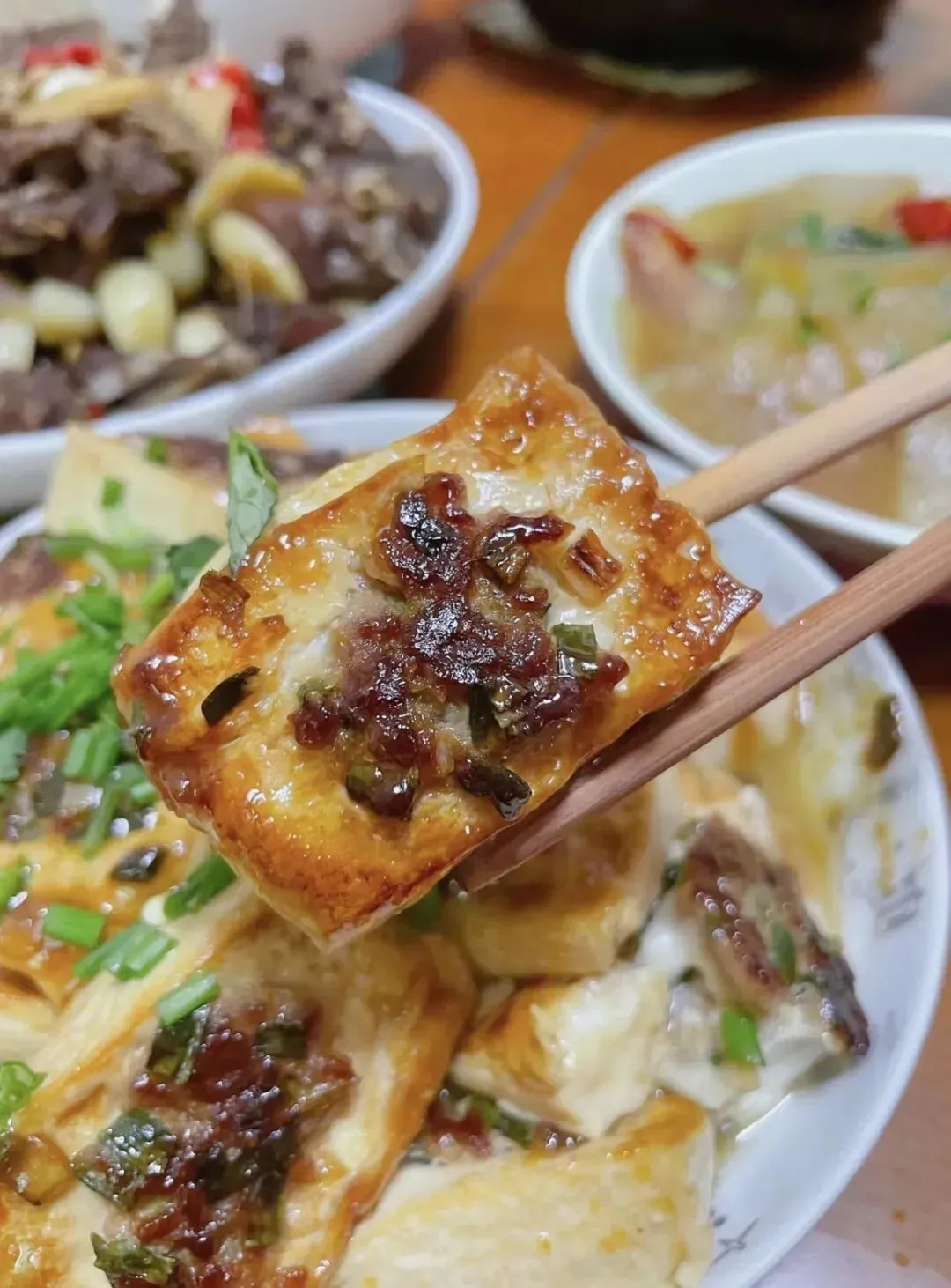 豆腐的外皮被煎得微焦,里面却软软嫩嫩的,上桌前撒些葱花,再配上紫金椒,简直不要太下饭。