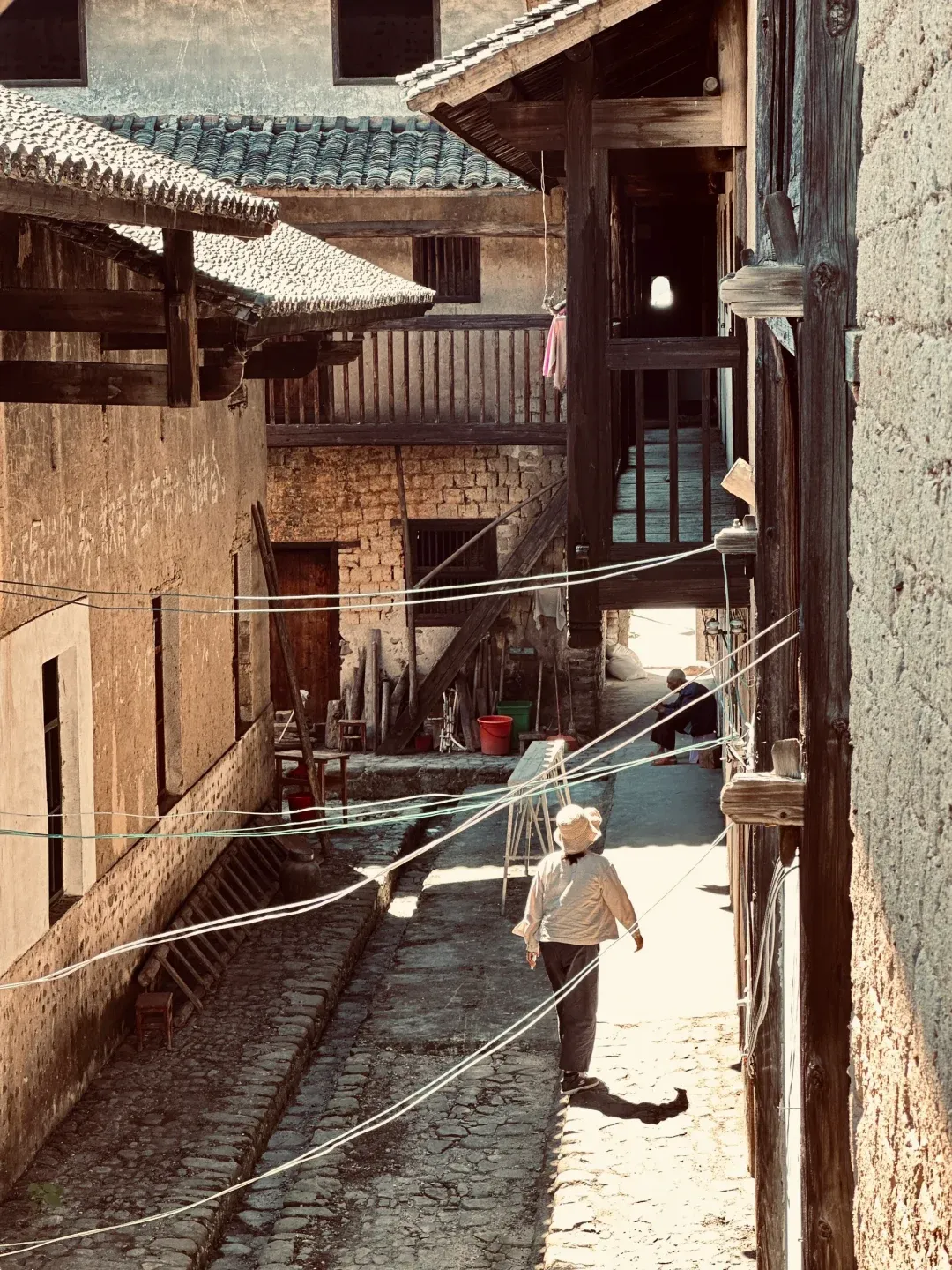 偶然能听到鸡打鸣的声音,二层能悬挂着的衣物,老人拾起的柴也堆在某个院子的角落,颇具烟火生活气。