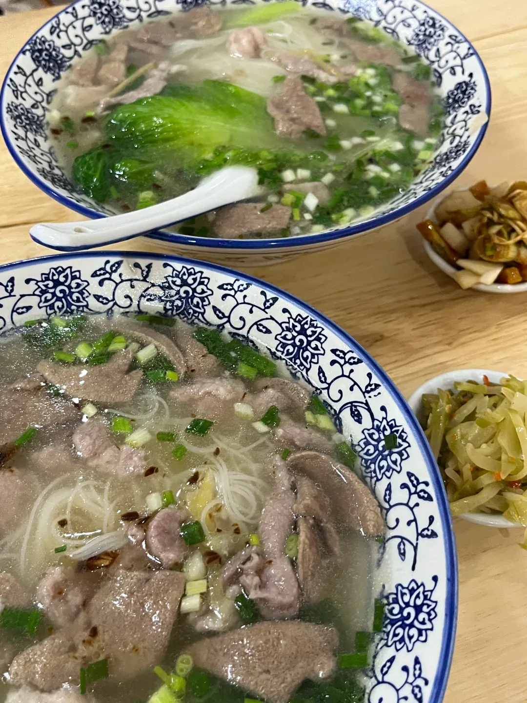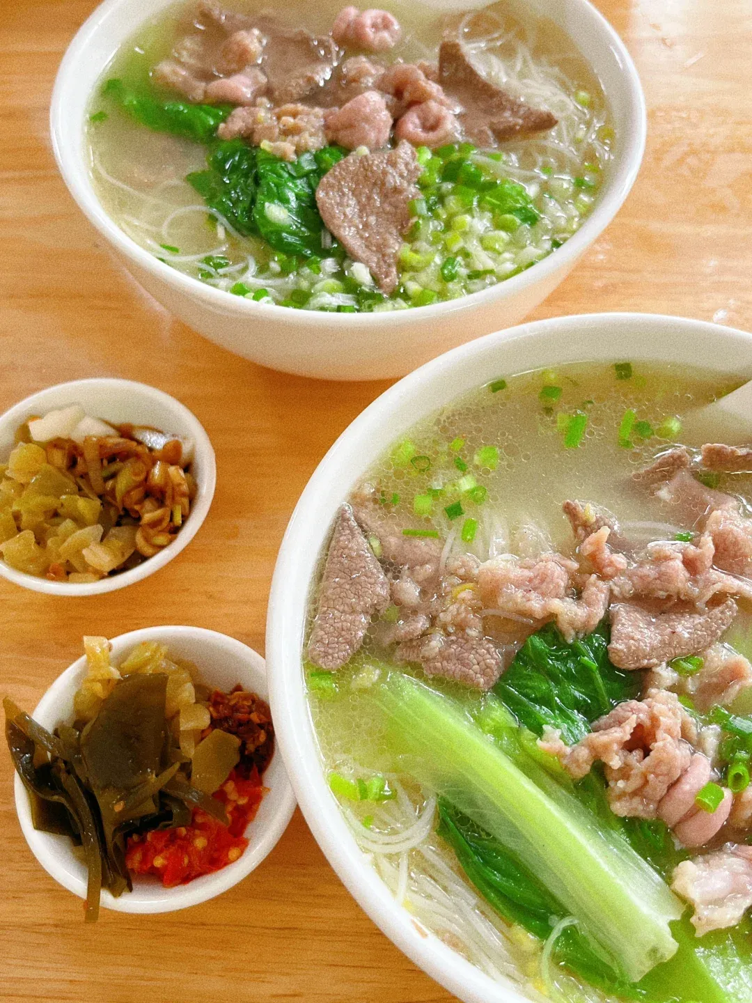 早餐的物价很感人。将米粉放入熬制多时的高汤中,加入肉片、蔬菜等配料,汤汁鲜美,米粉滑嫩,一碗下肚,暖胃又暖心。