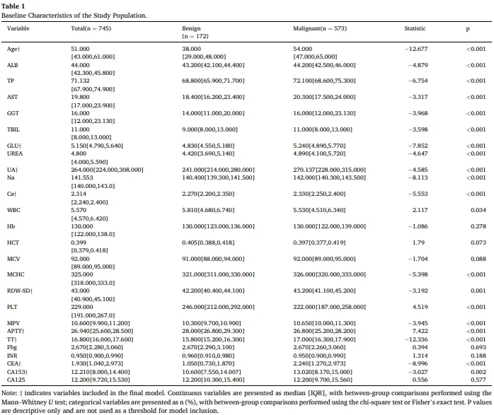 本研究成功构建并验证了一个基于常规实验室指标的逻辑回归模型,用于区分乳腺肿块的良恶性。模型仅使用年龄、TT、APTT、CEA和钙五个易获取指标,在内部和外部验证中均表现出良好的鉴别能力与临床适用性。