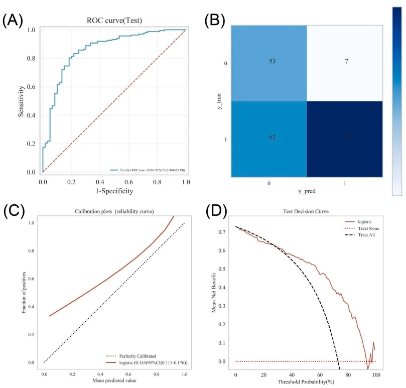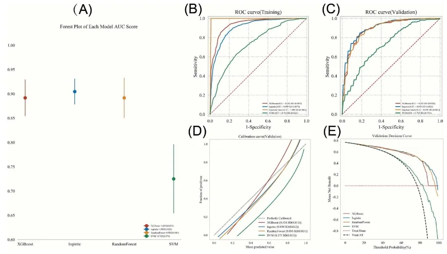在训练集中使用5折交叉验证比较XGBoost、逻辑回归、随机森林和SVM四种算法,以平均AUC为主要评价指标。最终选择逻辑回归作为最终模型,在固定测试集和外部验证集上进行性能评估,包括AUC、灵敏度、特异性、校准曲线、决策曲线分析及SHAP可解释性分析。