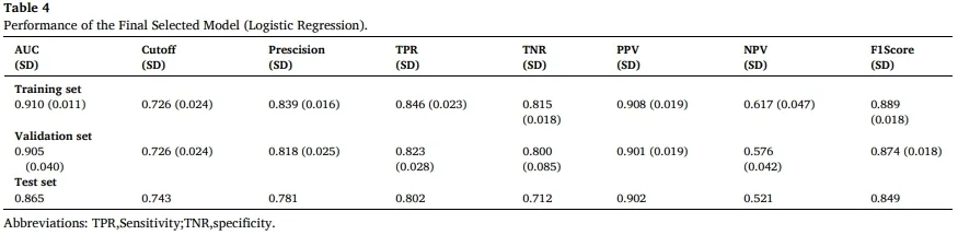 该表显示逻辑回归模型在训练集(AUC=0.910)、验证集(AUC=0.905)和测试集(AUC=0.865)中的稳定表现。