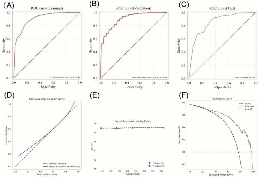 训练、验证和测试集的ROC曲线,AUC分别为0.910、0.905和0.865;测试集校准曲线显示预测概率与实际观测一致性良好;学习曲线显示模型已收敛,无过拟合;