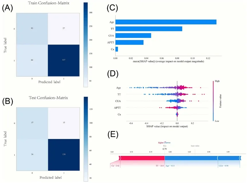 SHAP全局重要性排序:Age > TT > CEA > APTT > Ca;SHAP蜂群图显示Age、TT、CEA和Ca值越高风险越大,APTT越高风险越低;SHAP力图示例展示单个患者的风险贡献分解。