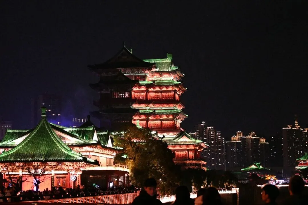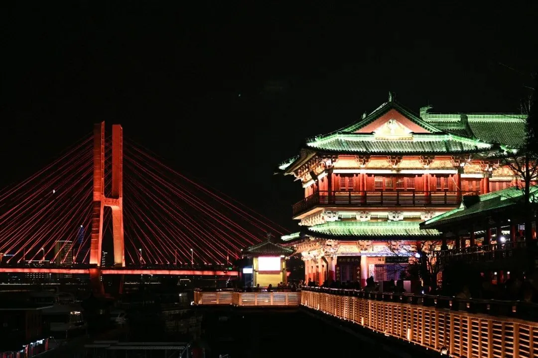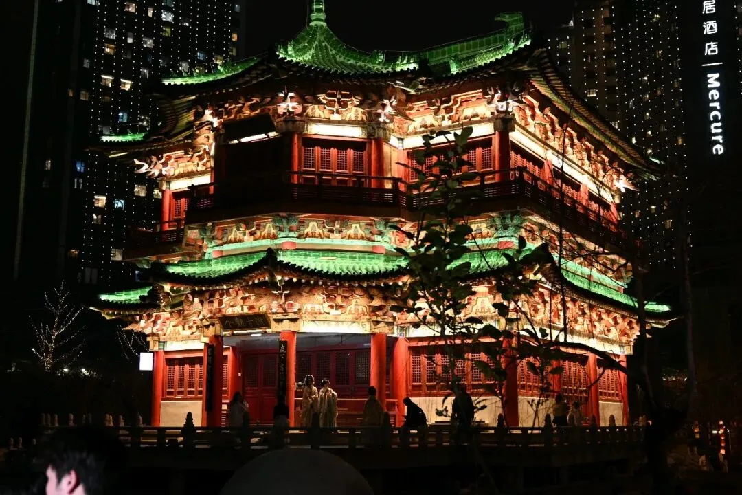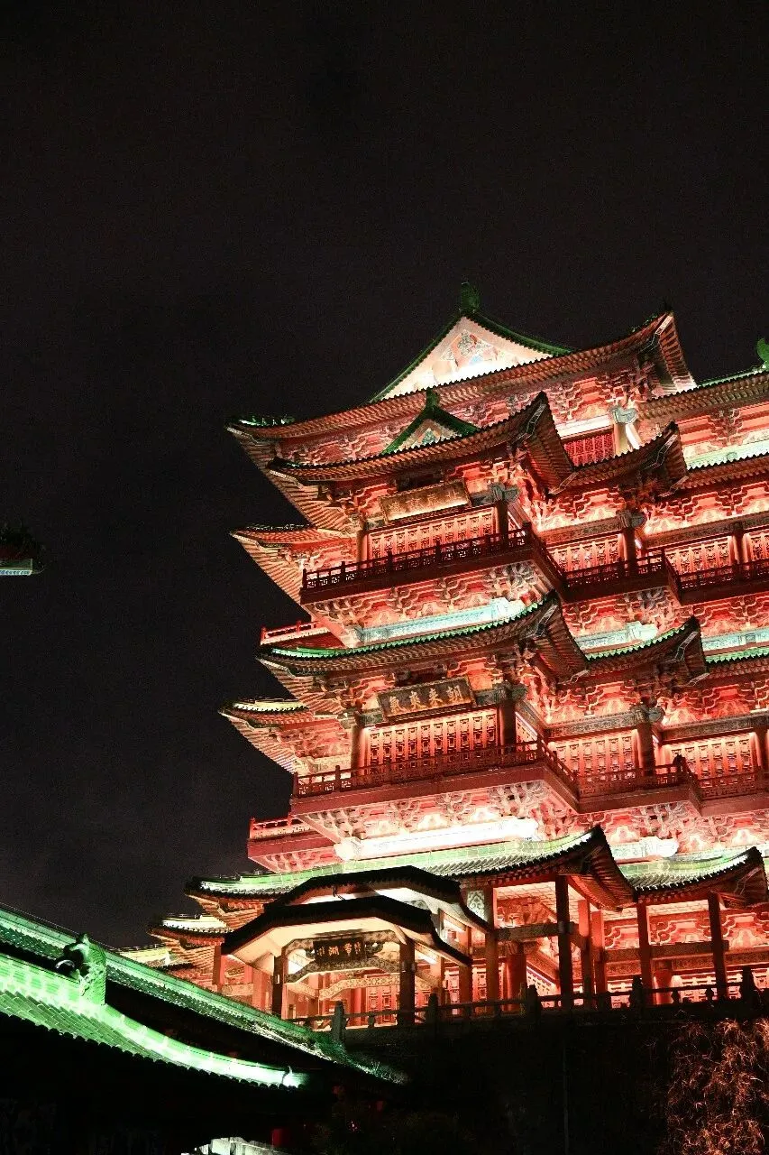 飞檐翘角在暖黄与青绿的灯光勾勒下,如展翅欲飞的鲲鹏,重现了“飞阁流丹,下临无地”的盛景。朱红的立柱与青灰的瓦当层次分明,每一处斗拱、每一块雕花都透着江南名楼的精致与大气。