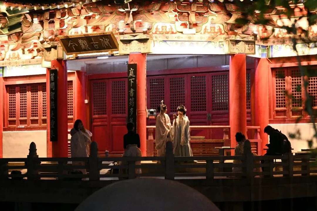街区入口的牌坊气势恢宏,“万寿宫”三个大字在灯光下熠熠生辉。红灯笼高高挂起,与青石板路、马头墙相映成趣,随手一拍都是古风大片。
