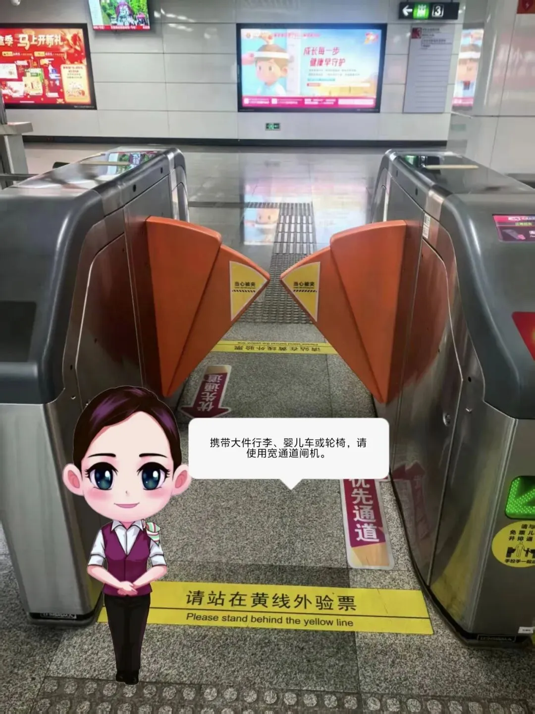 使用闸机时,请站在黄线外进行扫码、刷卡;如携带大件行李、婴儿车或轮椅,请使用宽通道闸机。