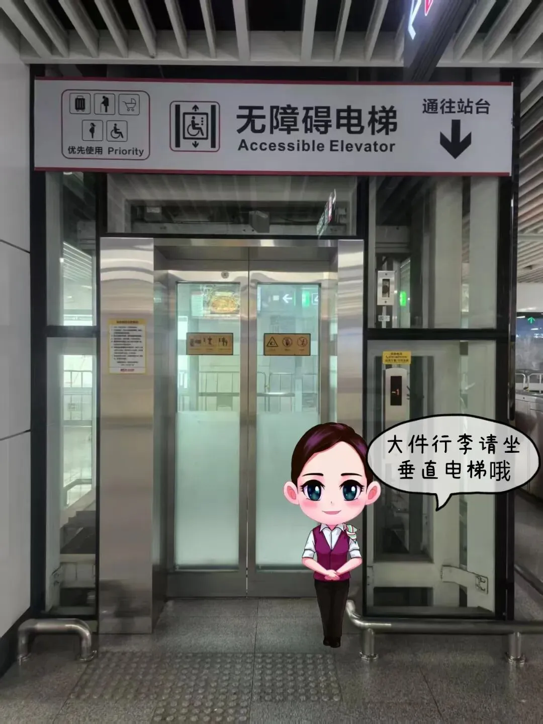 进出站或上下站台时,大件行李建议搭乘垂直电梯,安全又省力。