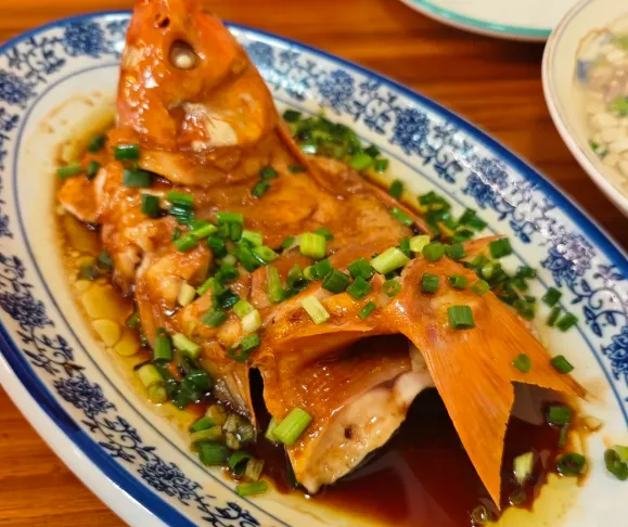 重点推荐荷包红鲤鱼。这鱼不腥,肉质细嫩。做法讲究个“炖”字,放进辣椒、生姜、料酒,在锅里咕嘟咕嘟炖透了。汤汁浓稠红亮,筷子一夹,鱼肉蘸着汤汁入口,鲜辣在舌尖炸开,一碗米饭根本不够。