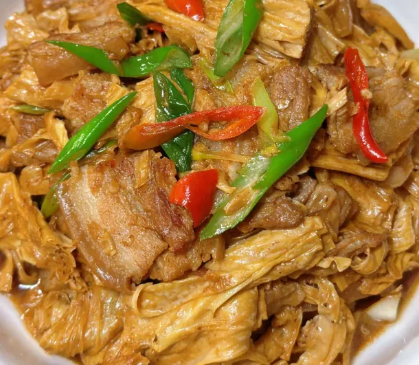 【高安腐竹烧肉】这道菜讲究的是"透"。干腐竹得用温水泡发,不能太软,要留点劲道。五花肉切片,下锅煸出油,加辣椒、蒜瓣爆香。肉烧得差不多了,腐竹下锅,大火翻炒,加一点高汤焖煮。关键是收汁,汤汁要浓稠地挂在腐竹上,油光发亮。出锅前撒一把大蒜叶,香气直冲天灵盖。