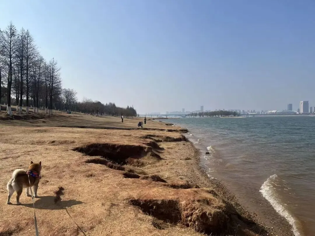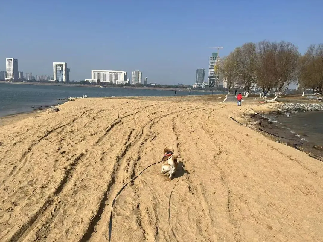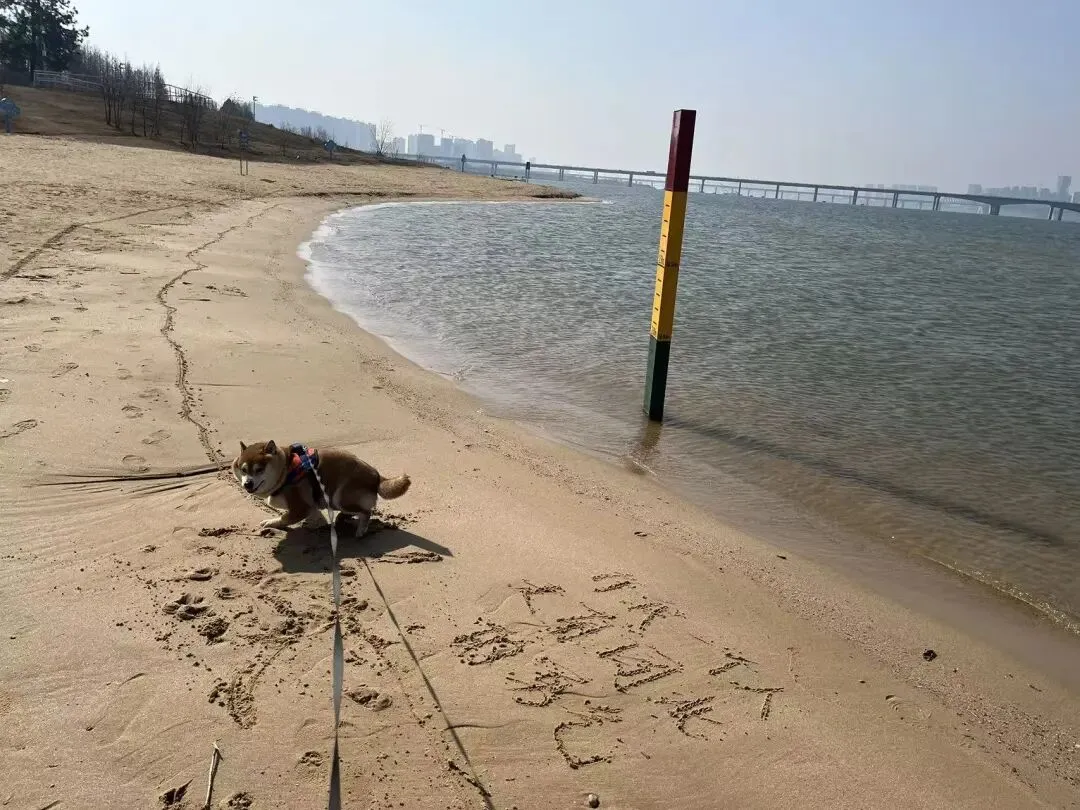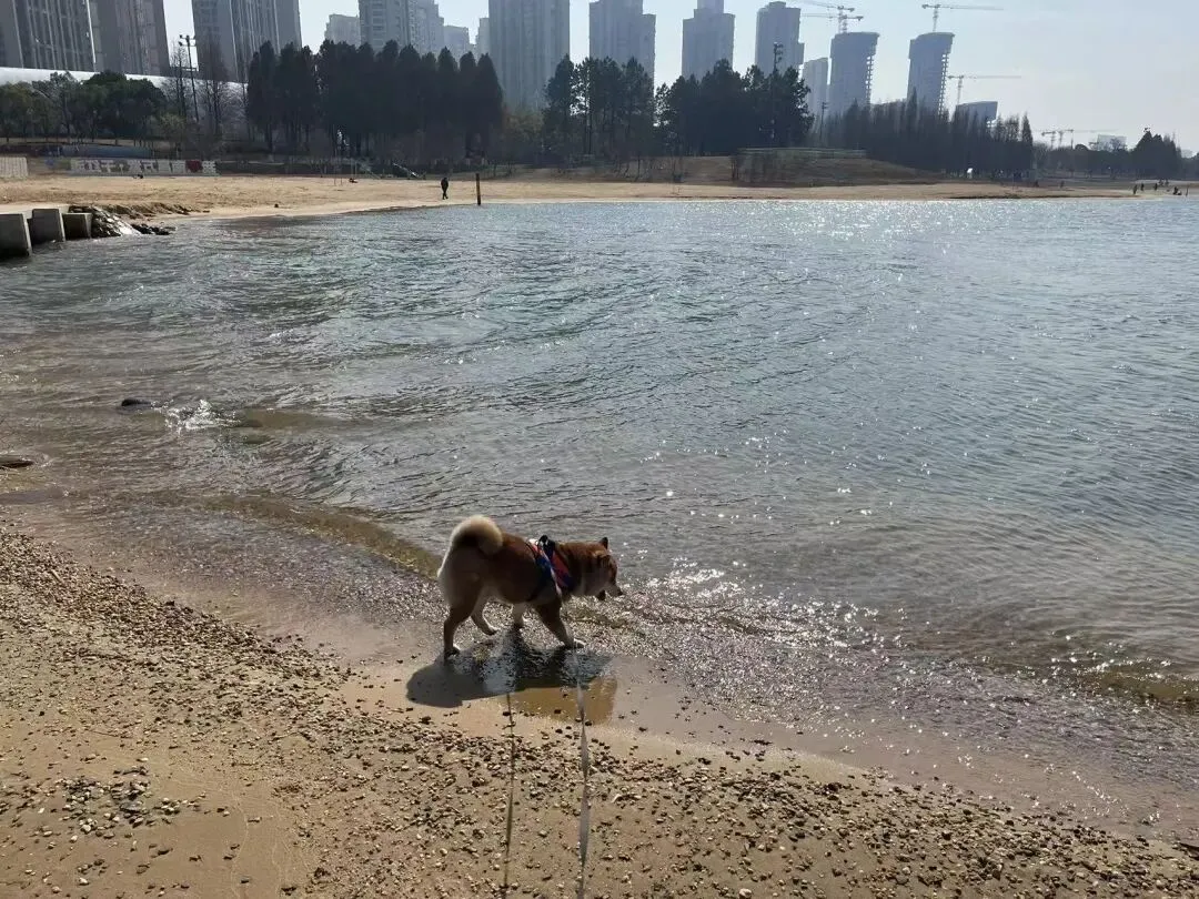 这里集齐了柴鸣喜欢的东西,水,沙,草地,树叶。人很少,放绳让柴鸣跑了一小段。