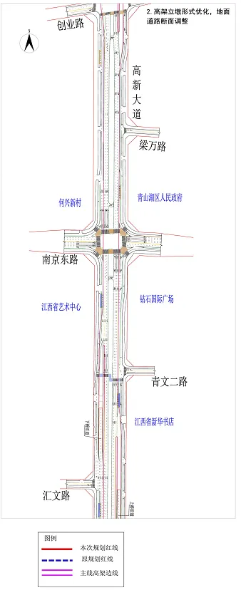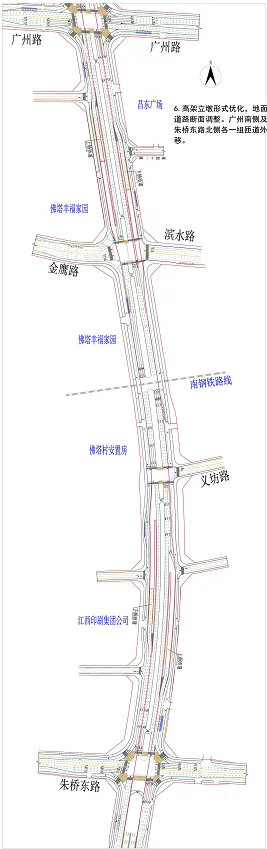 南昌都市圈的南北中轴线。这不仅将极大优化区域交通网络,更是落实南昌“东进、南延、西拓、北融、中兴”城市发展战略的关键支撑。这条快速路不仅将缩短跨区通行时间,更将激活沿线发展潜力,推动“交通线”向“经济带”转化。根据公布的批后方案,此次调整主要聚焦于高架立墩形式优化、地面道路断面调整与南昌大道立交方案优化调整: