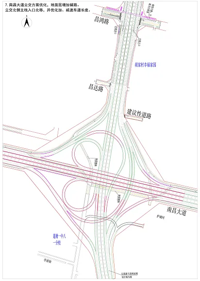 7、南昌大道立交方案优化,地面层增加辅路。立交北侧主线入口北移,并优化加、减速车道长度。