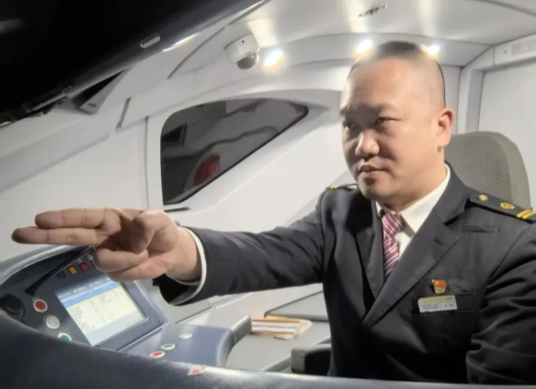 图为南昌动车车间副主任付悦正在值乘夜间高铁